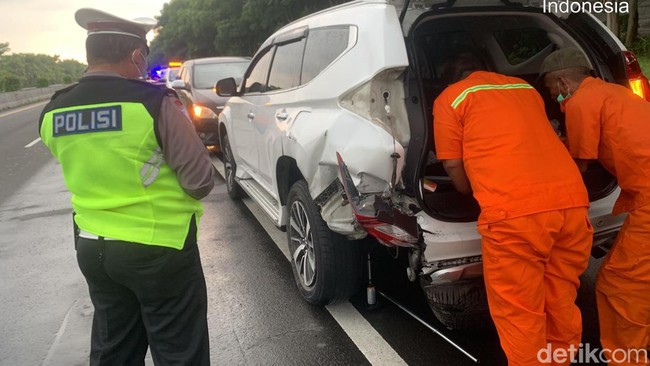 "Semula kendaraan Mitsubishi Pajero Sport bernopol L 1375 KY melaju dari barat ke timur di lajur kanan dan cuaca hujan deras, tepat di KM 10.600/B ruas Tol Manyar arah Tandes Barat, kendaraan tersebut mengalami pecah ban sebelah kiri bagian belakang," papar Ega, Minggu (3/4/2022).