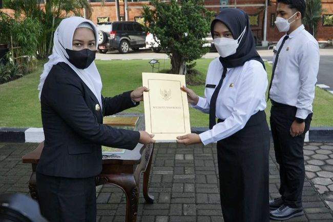 Wali Kota Mojokerto Ika Puspitasari menyerahkan SK resmi kepada 97 orang Calon Pegawai Negeri Sipil (CPNS) dan 72 orang Pegawai Pemerintah dengan Perjanjian Kerja (PPPK) Guru tahap 1 di lingkungan Pemkot Mojokerto. Penyerahan SK pengangkatan CPNS tersebut dilakukan di Halaman Kantor Pemkot Mojokerto, Jalan Gajah Mada No. 145 Senin kemarin.