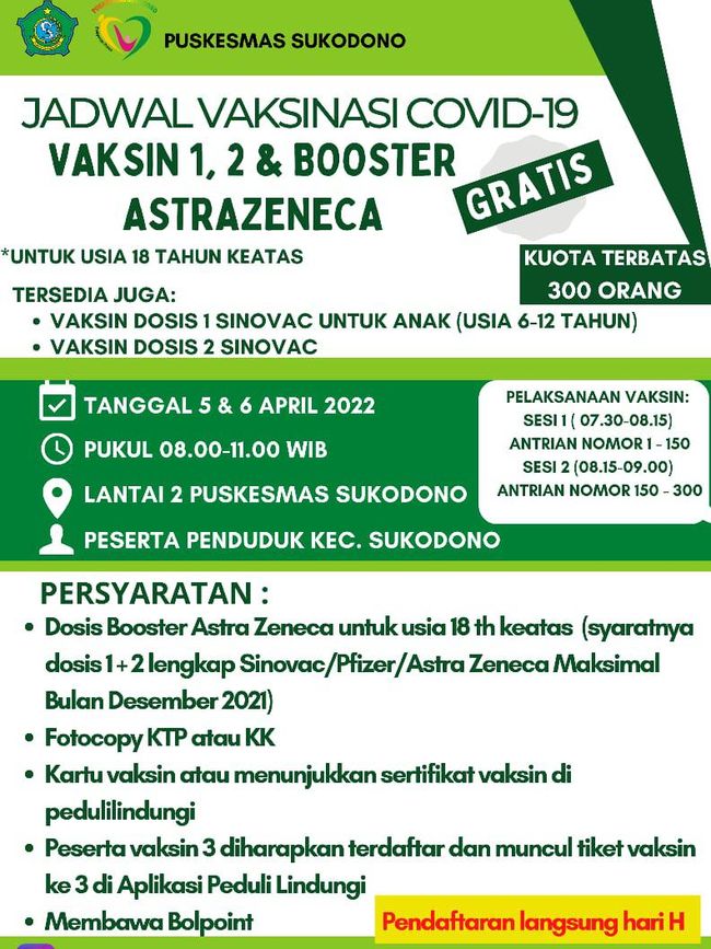 Vaksinasi COVID-19 digelar di lantai dua Puskesmas Sukodono mulai pukul 08-00-11.00 WIB. Pesertanya warga Kecamatan Sukodono. Warga bisa langsung daftar di lokasi.