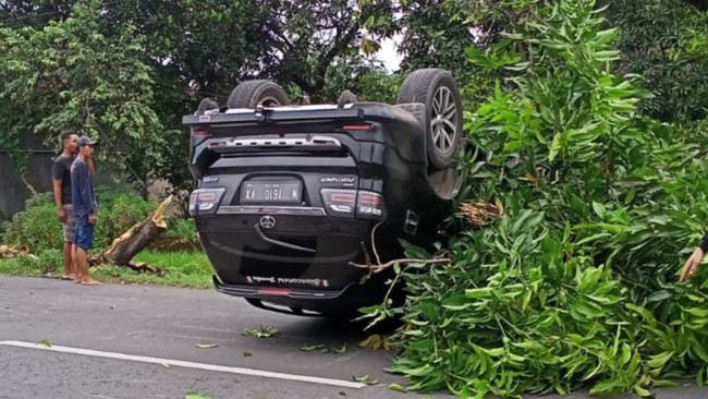 Sebuah Fortuner warna hitam menabrak pohon hingga terbalik di Jalan Raya Kemiri Kecamatan Tulangan, Sidoarjo. Akibat kecelakaan tunggal itu dua orang penumpang mengalami luka ringan.