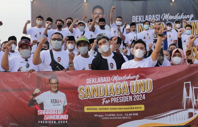Menteri Pariwisata dan Ekonomi Kreatif Sandiaga Uno kembali mendapatkan dukungan untuk maju dalam Pilpres 2024 mendatang. Dukungan ini didapatkannya dari relawan yang tergabung dalam Sahabat SandiUno Madura Raya.