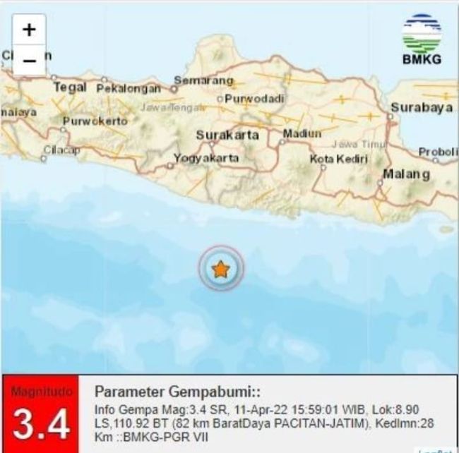 Gempa berkekuatan M 3,4 terjadi Pacitan, Jatim. Gempa bumi ini terjadi sekitar 15:59:01 WIB, Senin (11/4/2022).