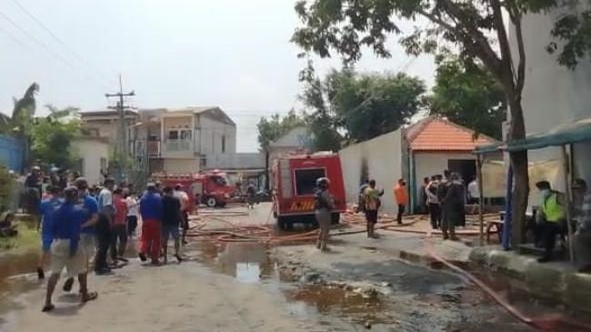 Si jago merah melahap 2 gudang di kawasan pergudangan Margomulyo Permai Blok Q, Kecamatan Sukomanunggal, Kota Surabaya pada Selasa pagi (12/4/2022). Hingga siang hari, petugas pemadam kebakaran masih berupaya memadamkan api pokok di lokasi kebakaran.