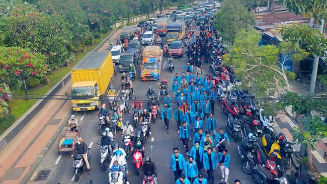 Pantauan detikJatim di lokasi, massa membawa sejumlah atribut unjuk rasa dari bendera organisasi, poster, memakai jas almamater mulai berdatangan.