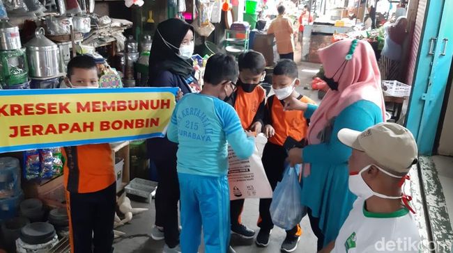 Siswa SDN Kertajaya IV Surabaya ikut menyosialisasikan stop penggunaan kantong plastik saat berbelanja. Para siswa bersama PD Pasar Surya, DLH, dan Komunitas Nol Sampah membagikan kantong nonplastik di pasar tradisional.