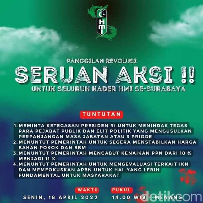 Himpunan Mahasiswa Islam (HMI) Cabang Kota Surabaya menyerukan demonstrasi bagi kadernya. Demo akan dilakukan pada Senin (18/4) dengan target DPRD Jatim.