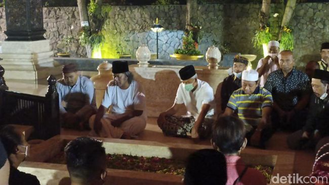 Usai salat tarawih, Gubernur Jateng Ganjar Pranowo nyekar di Makam Bung Karno Kota Blitar, Sabtu (16/4/22) malam. Saat nyekar, Ganjar tak sendirian namun bersama dengan Gus Muwafik.