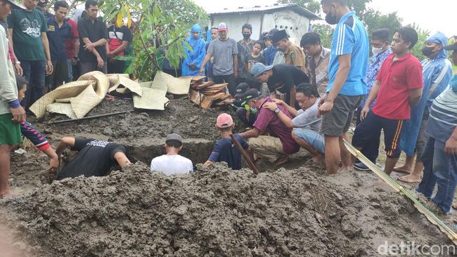 Di bawah guyuran hujan, dua mobil ambulans yang mengangkut tiga jenazah itu tiba. Tiga jenazah itu adalah pasangan suami istri Wahyu Wicaksono (30) dan Erna (30) serta satu anaknya, Alfan (4).