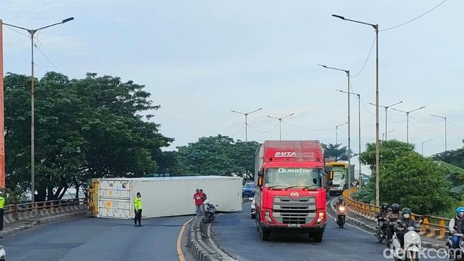 "Dugaan sementara bahwa penyebab truk trailer tersebut tidak kuat nanjak. Sehingga terguling bahkan box kontainer terlepas," kata Sugeng, Kamis (21/4/2022).