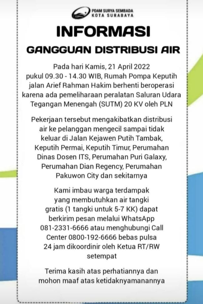 PDAM Surya Sembada Surabaya mengumumkan melalui Instagram story @pdamsuryasembada, ada sejumlah wilayah terdampak gangguan itu.