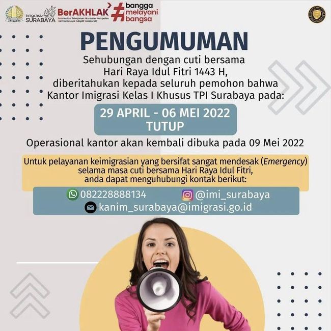 Kantor Imigrasi Kelas I Khusus TPI Surabaya memberi informasi terkait libur hari raya Idul Fitri 2022. Yakni soal pelayanan keimigrasian, seperti permohonan paspor.