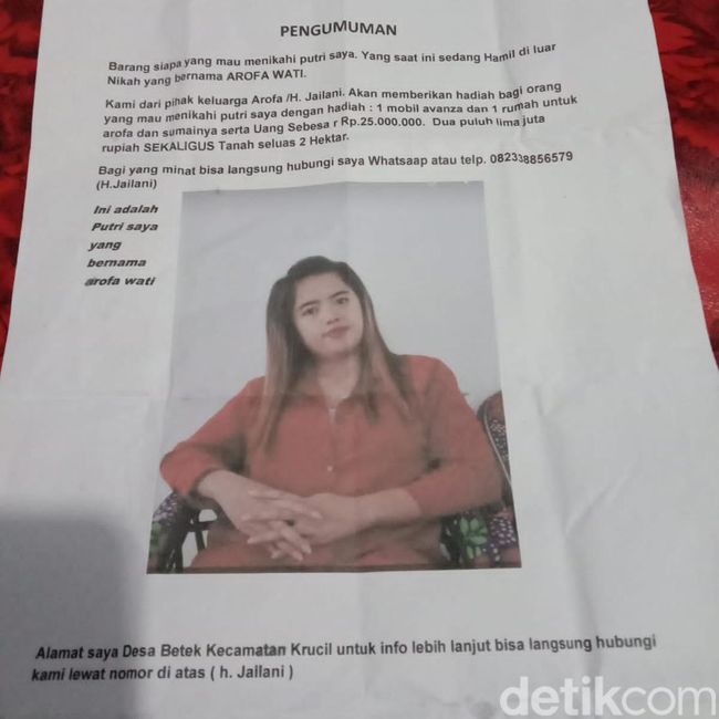 "Akan memberikan hadiah bagi orang yang mau menikahi putri saya dengan hadiah: 1 mobil Avanza dan 1 rumah untuk Arofa dan suaminya serta uang sebesar Rp 25 juta rupiah sekaigus tanah seluas 2 hektar," terang selebaran itu.