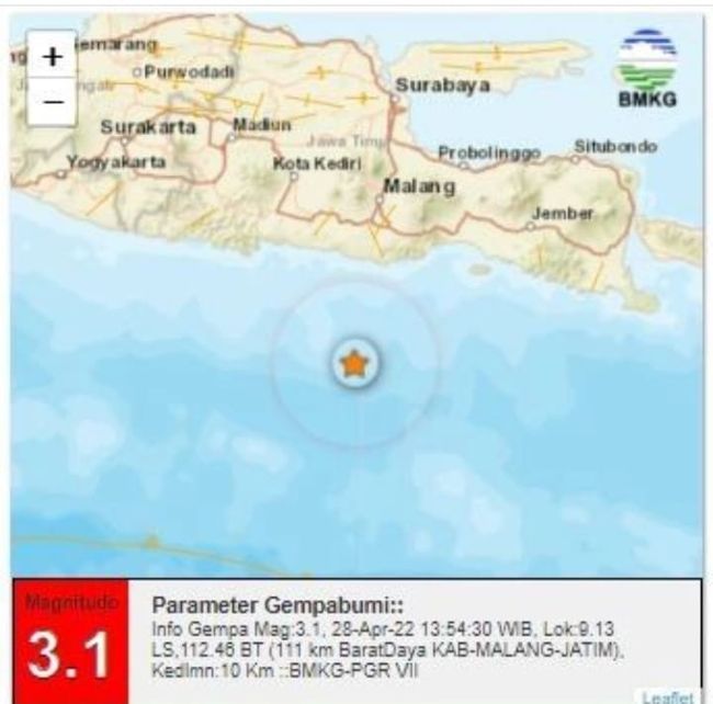 Peristiwa gempa pertama terjadi Malang bermagnitudo 3.1. Peristiwa itu terjadi 13:54:30 WIB, Kamis (28/4/2022).