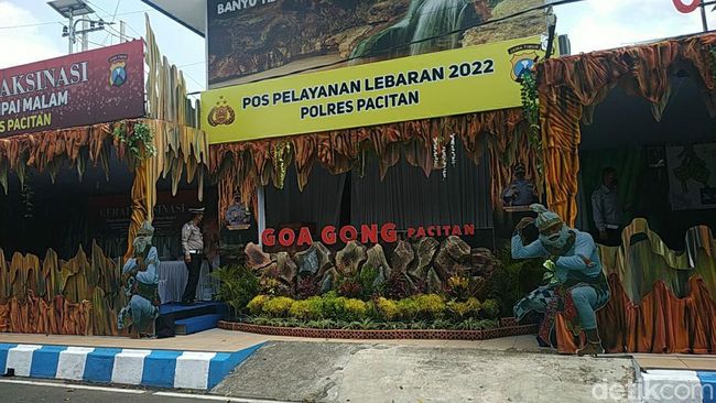 Pos Pelayanan Lebaran di Pacitan ini tergolong unik. Bangunan di Jalan Imam Bonjol tersebut memadukan dua ikon milik Kabupaten Pacitan. Yaitu Gua Gong dan Seni Tari Kethek Ogleng.