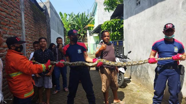 Ular sanca mengagetkan warga yang tengah merayakan Lebaran 2022 di Kelurahan Bandar Kidul, Kecamatan Mojoroto, Kota Kediri. Pasalnya, ular sepanjang 4 meter itu diketahui bersembunyi di dalam mesin cuci.