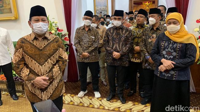 "Terima kasih, malam hari ini saya dapat kehormatan diterima Ibu Khofifah, ibu gubernur, kebetulan saya sedang berada di Jatim sowan kepada tokoh-tokoh di sini dalam rangka lebaran, menjenguk sahabat-sahabat lama saya. Dan tentunya pantas dan saya merasa perlu sowan ke Ibu Gubernur, Ibu Khofifah tadi diterima sangat baik," kata Prabowo usai pertemuan tertutup dengan Khofifah di Gedung Negara Grahadi, Selasa (3/5/2022) malam.
