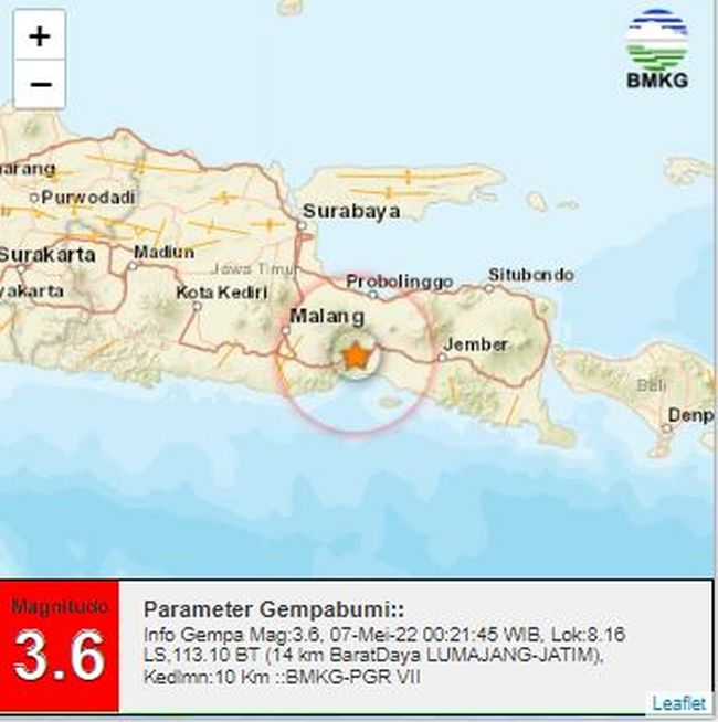 "Dirasakan (MMI) III-IV Pasirian, III-IV Pronojiwo, III-IV Sendupuro, III-IV Candipuro, III-IV Pasrujambe," tulis twitter @infoBMKG yang dilihat detikJatim di Surabaya, Sabtu (7/5/2022).