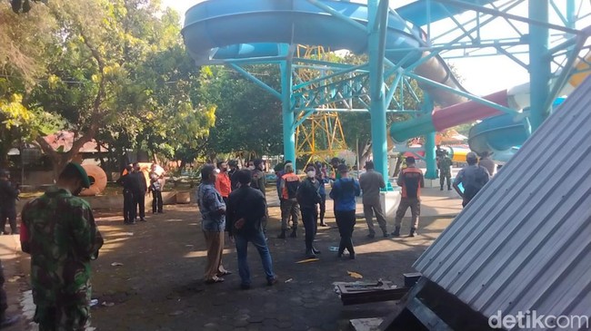 Perosotan kolam renang Kenjeran Water Park di area Kenpark Surabaya ambrol. Polisi menyebut insiden ini menyebabkan 15 orang terluka.
