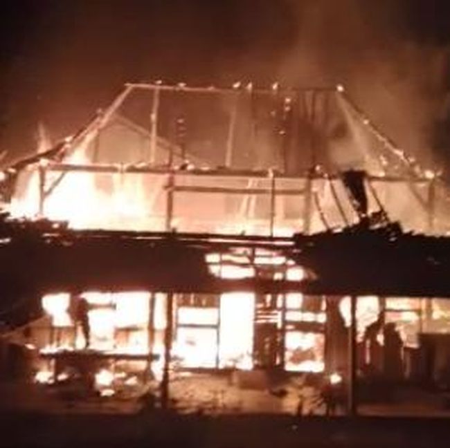 Diduga bangunan sengaja dibakar oleh IF yang tak lain anak kandung Miswadi. Kobaran api meludeskan seluruh bagian bangunan berbahan kayu tersebut.