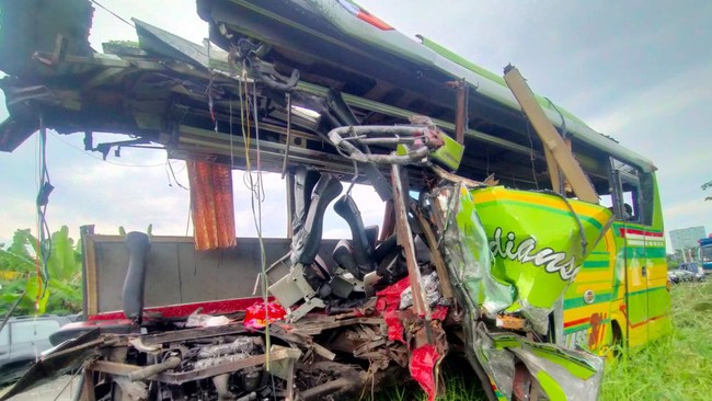 "Kondisi mobil, seperti kita saksikan bersama, itu hancur. Terutama bagian depan sebelah kiri. Hancur, ya. Roda depan juga terlepas. Setir bus juga terlepas," ujar Kombes Dirmanto Kabid Humas Polda Jatim di Wika, Waru, Sidoarjo, Selasa (16/5/2022).