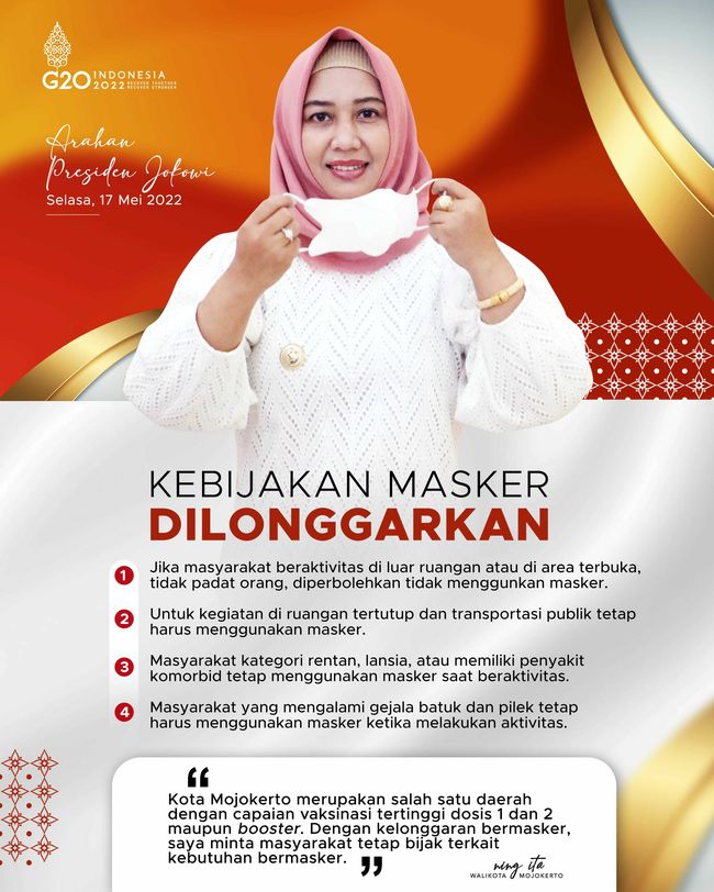 Wali Kota Mojokerto Ika Puspitasari memberikan tanggapan terkait kebijakan pelonggaran masker oleh Pemerintah Pusat. Ning Ita, sapaan akrabnya, tidak keberatan jika warga Kota Mojokerto menerapkan kebijakan tersebut.