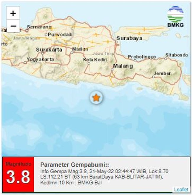 Gempa pertama terjadi pada pukul 02:44:47 WIB, Sabtu (21/5/2022). Dengan lokasi di 8.70 Lintang Selaran dan 112.21 Bujur Timur. Pusat gempa berada di 63 km Barat Daya Kabupaten Blitar dengan kedalaman 10 Km.