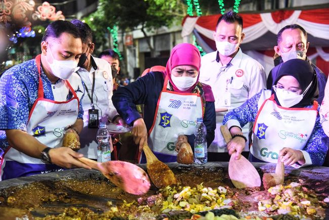 Gubernur Jatim Khofifah Indar Parawansa dan Wali Kota Surabaya Eri Cahyadi hadir bersama di Festival Rujak Uleg. Festival Rujak Uleg ini peringati Hari Jadi Kota Surabaya ke-729.