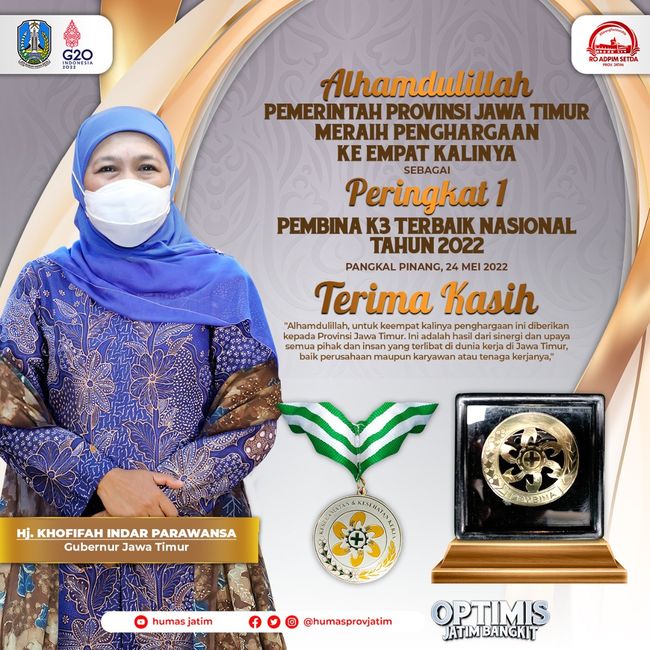 Pemerintah Provinsi Jawa Timur kembali menerima penghargaan Pembina K3 Terbaik tingkat nasional di tahun 2022. Adapun penghargaan peringkat pertama ini sudah diraih empat kali berturut-turut sejak tahun 2019.