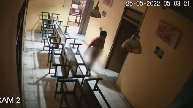 Di rekaman CCTV, pria tersebut awalnya turun dari sepeda motor. Saat itu dia masih mengenakan busana lengkap. Kemudian dia masuk ke kafe melalui pintu yang tidak terkunci.
