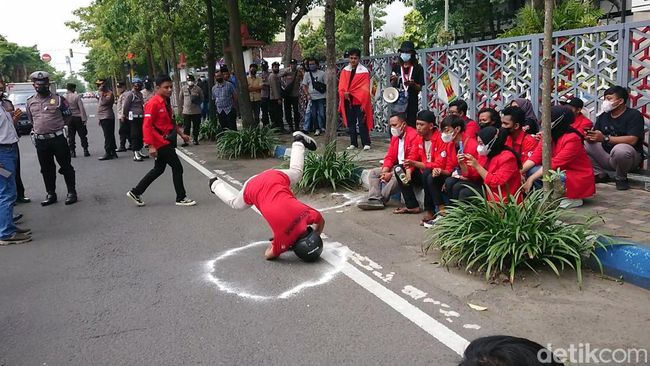 Sejumlah mahasiswa di Tulungagung menggelar aksi unjuk rasa teatrikal di depan kantor bupati. Mereka memprotes bupati yang dinilai ingkar janji memperbaiki ruas jalan kabupaten yang rusak parah.