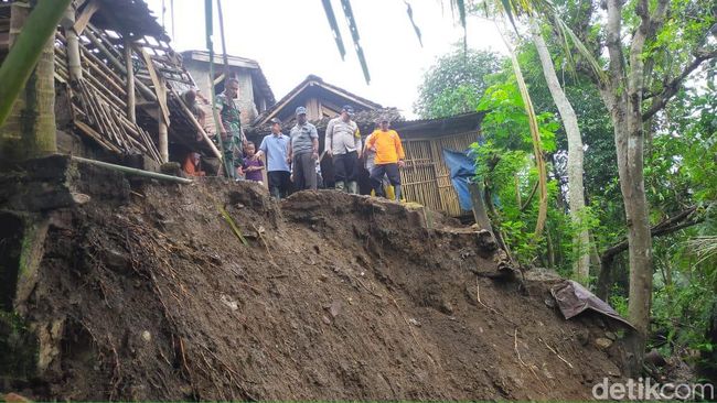 Hujan deras yang terjadi semalam menyebabkan longsor di Desa Pucanganak, Tugu, Trenggalek. Dampaknya, bangunan kamar mandi dan kandang kambing milik warga hancur terseret longsor.