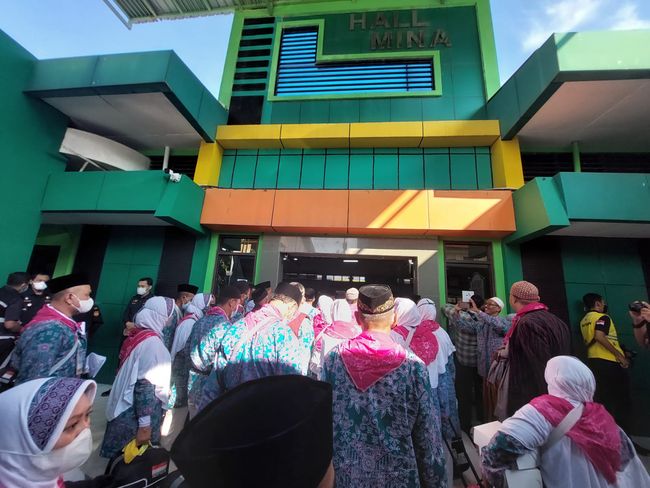 Ratusan jemaah kloter Embarkasi Surabaya berkumpul terlebih dahulu di Hall Mina. Jemaah diberikan pemeriksaan kesehatan dan pembekalan sebelum berangkan ke tanah suci Mekkah.