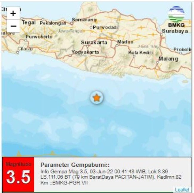 Sementara gempa di Pacitan bermagnitudo 3,5. Gempa ini terjadi dini hari pukul 00:41:48 WIB. Lokasi gempa di 8.89 Lintang Selatan, 111.06 Bujur Timur, tepatnya di 79 kilometer Barat Daya Pacitan. Kedalaman gempa berada di 82 kilometer.