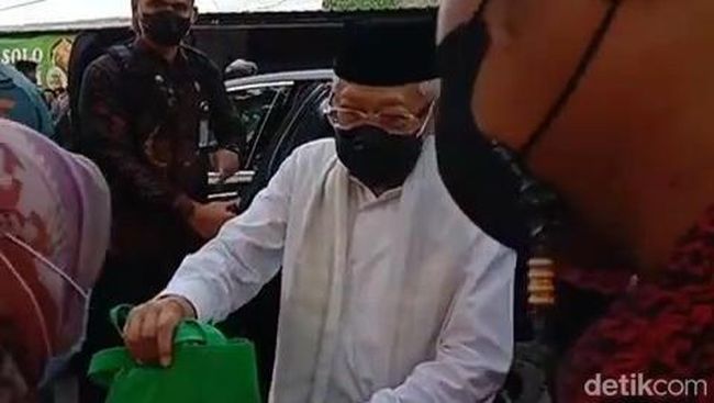Wakil Presiden KH Ma'ruf Amin menyapa warga dan membagikan sajadah di Desa Pesanggrahan, Kutorejo, Mojokerto. Ia berpesan kepada warga agar memanfaatkan sajadah tersebut untuk salat tahajud.