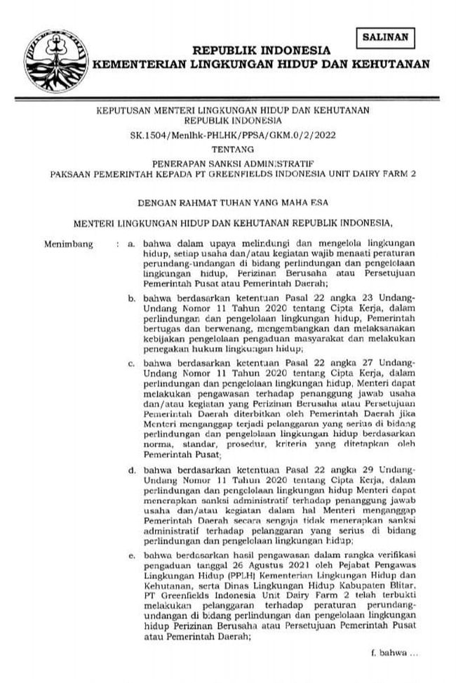 "Kemen LHK sebenarnya sudah turun langsung sebelum memberikan saksi administratif itu. Dalam surat itu, PT Greenfield harus melakukan perbaikan. Yang pointnya bagaimana caranya agar limbah kotoran sapi itu tidak mencemari lingkungan. Dan KLHK memberikan batas waktu maksimal 45 hari kalender setelah ditetapkannya surat itu," ungkapnya.