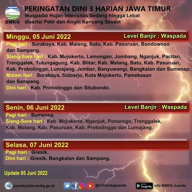 Peringatan 3 harian tersebut berlaku sejak Minggu (5/6/2022) hingga Selasa (7/6/2022). Berikut rincian daerah Jatim yang diperkirakan akan dilanda hujan intensitas sedang hingga lebat serta angin kencang sesaat.