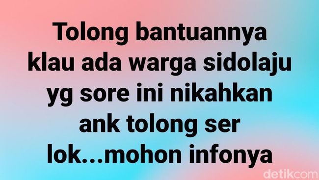 "Tolong bantuannya klau ada warga sidolaju yg sore ini nikahkan ank tolong ser lok...mohon infonya"