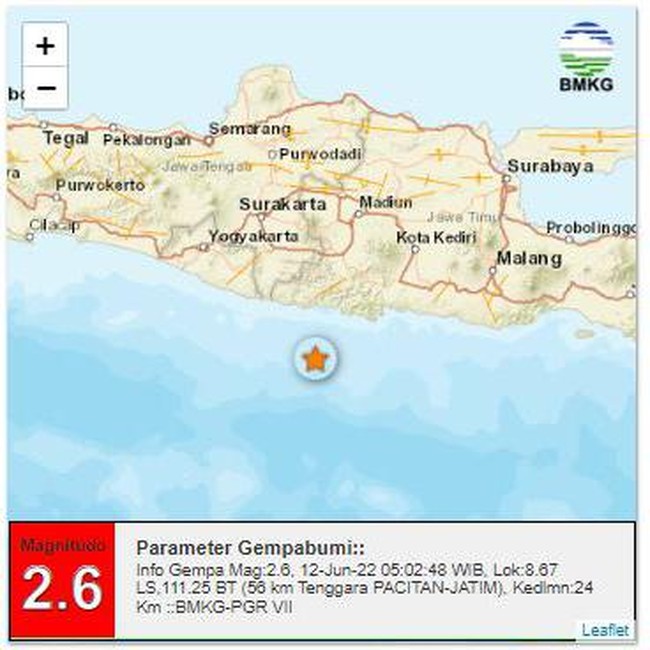 Dikutip dari @bmkgjogja, gempa 2,6 mengguncang Pacitan pada pukul 05.02. gempa berlokasi di 8.67 Lintang Selata, 111.25 Bujur Timur atau 56 km tenggara Pacitan dengan kedalaman. 24 Km.