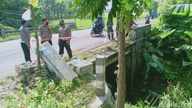 Beton cor paduan batu kali setinggi sekitar satu meter tersebut hancur hingga berantakan berserakan di plengsengan sungai. Besi penyambung beton cor sepanjang sekitar empat meter itu jatuh ke dasar sungai sedalam sekitar 6 meter.