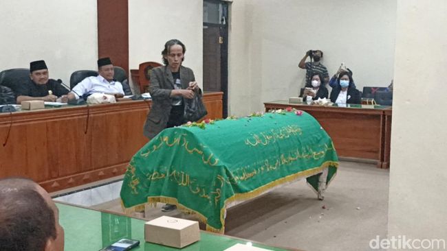 Puluhan warga Kelurahan Kelutan, Kecamatan/Kabupaten Trenggalek membawa keranda mayat dalam ruang rapat DPRD saat melakukan hearing dengan anggota dewan. Warga menuntut sebuah makam tidak berizin untuk dipindahkan.