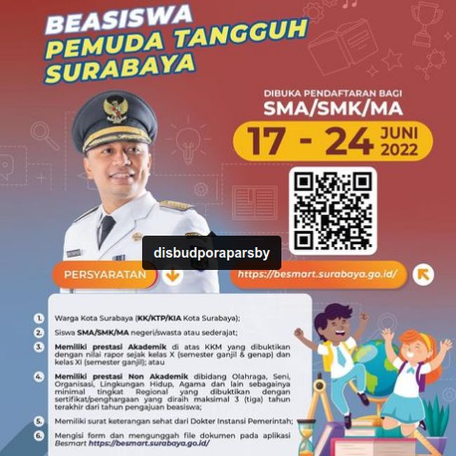 Pendaftaran Beasiswa Pemuda Tangguh Surabaya untuk jenjang SMA/SMK/MA telah dibuka rek! Info lengkapnya di laman besmart.surabaya.go.id ya.