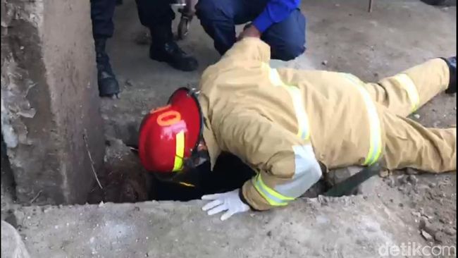 Empat anggota damkar dari Tim Satria Biru akhirnya diterjunkan ke lokasi laporan untuk menjalankan operasi bantuan. Untuk mengambil kunci tersebut, petugas harus membuka cor penutup selokan setebal 25 sentimeter.
