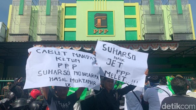 Berdasar pantauan detikJatim di lokasi, puluhan massa Front P3 tiba sekitar pukul 13.50 WIB. Massa membawa sejumlah banner dan spanduk yang bertuliskan 'Suharso Monoarfa Mundur Dari Ketum PPP'.