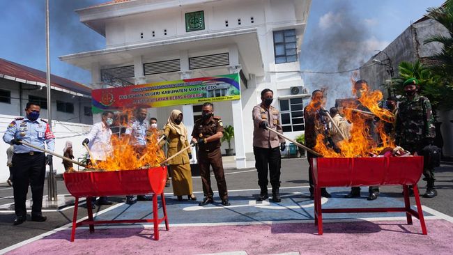 Berbagai barang bukti kejahatan pada semester pertama 2022 itu dimusnahkan Kajari Kabupaten Mojokerto Gaos Wicaksono bersama Bupati Ikfina Fahmawati dan Kapolres AKBP Apip Ginanjar. Hadir pula perwakilan Pengadilan Negeri Mojokerto, Lembaga Pemasyarakatan dan Kodim 0815.