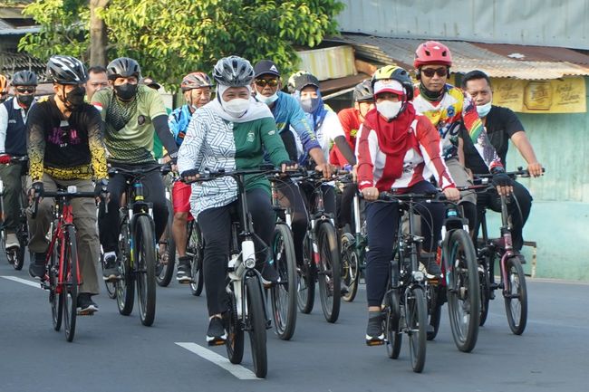 Gubernur Jawa Timur Khofifah Indar Parawansa dan Wali kota Mojokerto Ika Puspitasari bersepeda bersama pada Minggu (26/6). Kegiatan yang berlangsung dalam rangkaian peringatan HUT ke-14 itu juga diikuti sejumlah masyarakat Kota Mojokerto.