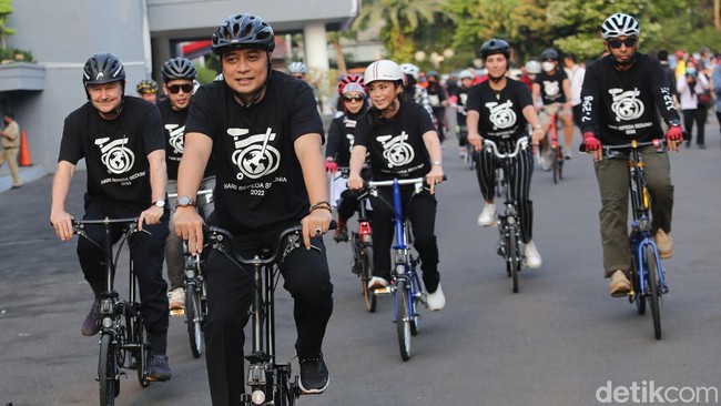 "Bingung kabeh, pakai sepeda larang rek (bingung semua pakai sepeda mahal rek), jangan sampai jatuh, dipinjami soalnya ini," kelakar Eri di Balai Kota, Rabu (29/6/2022).