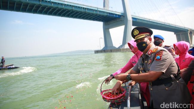 Ditpolairud Polda Jatim menggelar acara tabur bunga di kawasan Tanjung Perak, Surabaya. Acara tersebut merupakan rangkaian memperingati HUT ke-76 Bhayangkara 2022.