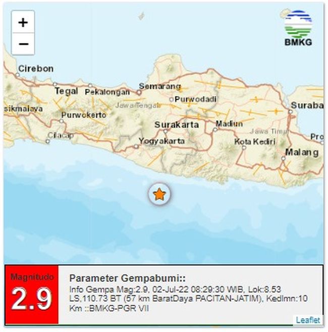 Gempa M 2,9 mengguncang wilayah Pacitan, Jawa Timur. Gempa ini terjadi pagi ini pukul 08:29:30 WIB.