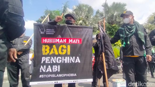Berdasarkan pantauan detikJatim di lokasi. Sebagian di antara massa juga terlihat membawa spanduk berisi nama ormas. Salah satu yang kentara di sejumlah spanduk dan bendera adalah Jemaah Ansyaru Syariah.
