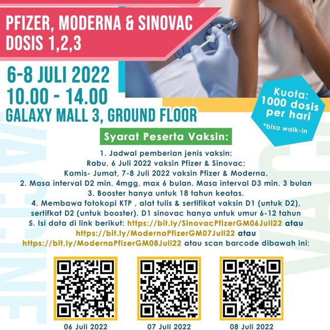 Vaksinasi COVID-19 tersebut digelar dengan menyediakan 1.000 dosis per hari. Penyuntikan vaksin dilakukan di Galaxy Mall 3, ground floor.